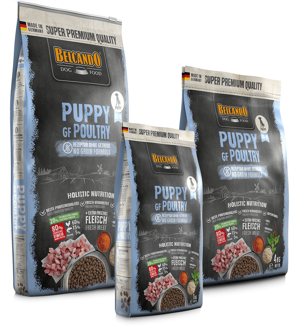 H BELCANDO® Puppy GF Poultry είναι μια πλήρης ξηρά τροφή με 40 % φρέσκο κρέας για κουτάβια όλων των φυλών έως και 3 μηνών και για νεαρούς σκύλους μικρόσωμων φυλών έως το τέλος της ανάπτυξης τους, με αλλεργίες στα σιτηρά, τη γλουτένη ή δυσανεξίες.
