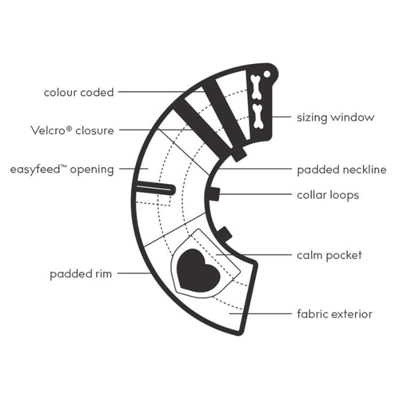 Ειδική πατέντα με άνοιγμα EasyFeed που επιτρέπει στα ζώα να τρώνε και να πίνουν με ευκολία. Μαλακή γαλάζια εσωτερική επένδυση, με κατευναστική επίδραση για το κατοικίδιο. Πολύχρωμες ρυθμιζόμενες ταινίες Velcro για απόλυτη εφαρμογή. Πλένεται στο πλυντήριο.