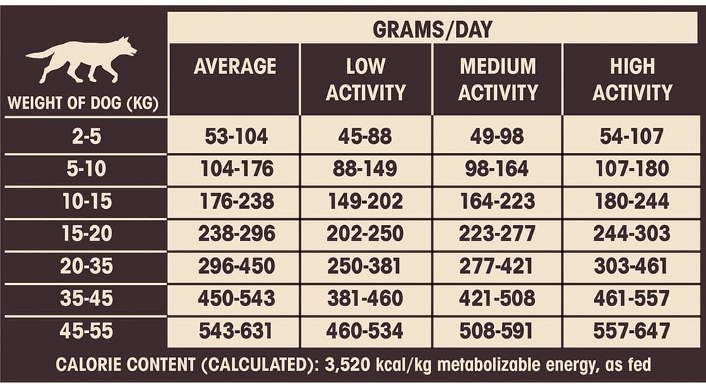 Κάθε σκύλος είναι διαφορετικός και η ποσότητα παρεχόμενης τροφής είναι πιθανό να αλλάζει με βάση την ηλικία και τον τρόπο ζωής του. Χρησιμοποιήστε την συνιστώμενη δόση σαν οδηγό, παρακολουθείστε το βάρος του και προσαρμόστε ανάλογα τις ποσότητες για τον μικρό μας φίλο. Ταΐστε τον δύο φορές την ημέρα, έχοντας πάντα δίπλα του φρέσκο, καθαρό νερό!