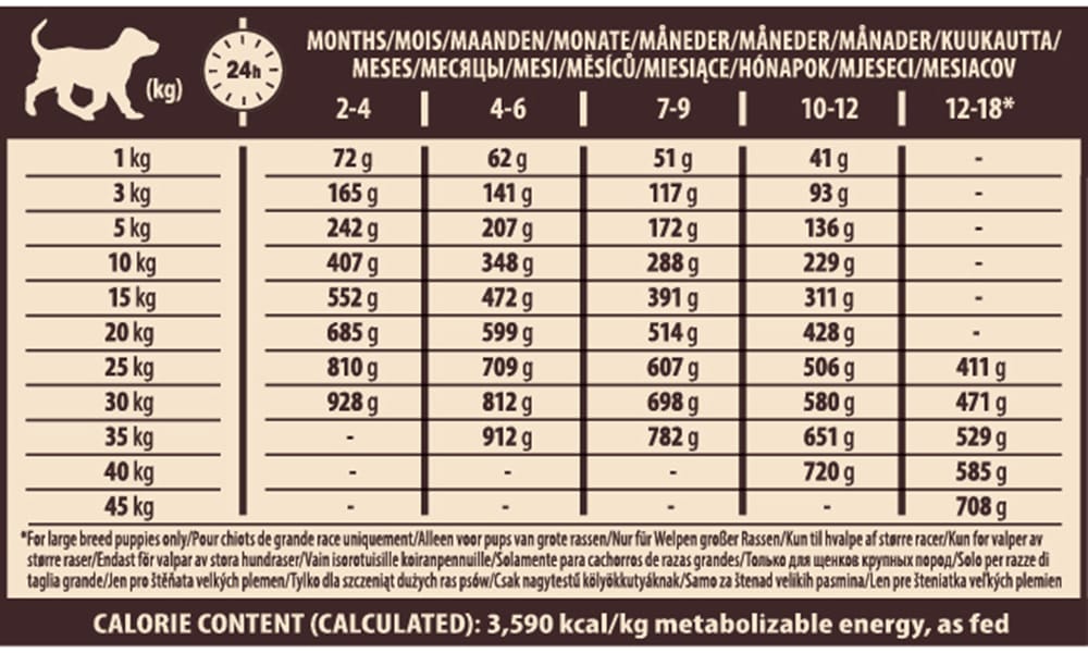 Κάθε σκύλος είναι διαφορετικός και η ποσότητα παρεχόμενης τροφής είναι πιθανό να αλλάζει με βάση την ηλικία και τον τρόπο ζωής του. Χρησιμοποιήστε την συνιστώμενη δόση σαν οδηγό, παρακολουθείστε το βάρος του και προσαρμόστε ανάλογα τις ποσότητες για τον μικρό μας φίλο. Ταΐστε τον δύο φορές την ημέρα, έχοντας πάντα δίπλα του φρέσκο, καθαρό νερό!