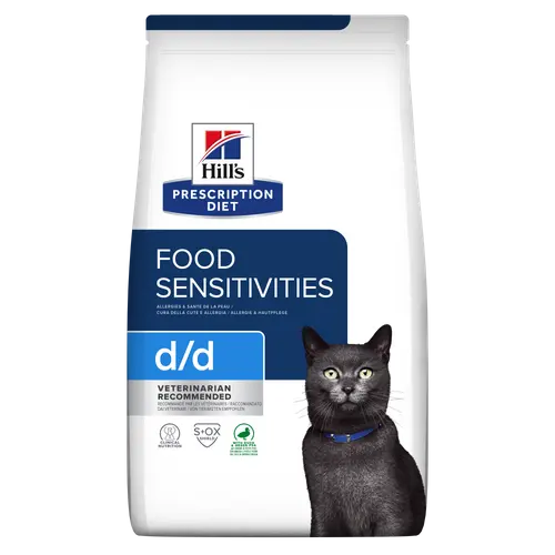 Οι διατροφολόγοι & οι κτηνίατροι της Hill’s ανέπτυξαν την Prescription Diet d/d – Duck & Green Pea μια διαιτητική τροφή με σύνθεση από πρωτεΐνη πάπιας ειδικά σχεδιασμένη για να υποστηρίζει γάτες με τροφικές ευαισθησίες. Μάλιστα, η d/d είναι διατροφή που έχει αποδειχθεί κλινικά ότι βοηθά στην αποφυγή ανεπιθύμητων αντιδράσεων σε τροφές.