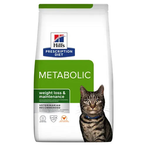 Οι διατροφολόγοι & κτηνίατροι της Hill’s ανέπτυξαν την κλινική διατροφή Prescription Diet Metabolic με σύνθεση ειδικά σχεδιασμένη να βοηθά τις γάτες να χάσουν βάρος και να μην ξαναπάρουν το βάρος που έχασαν. Συνεργάζεται φυσικά με τη μοναδική χρήση ενέργειας από τη γάτα σας για εύκολη και αποτελεσματική απώλεια βάρους. Αυτή η τροφή διεγείρει τη φυσική ικανότητα της γάτας να καίει λίπος και παρέχει ενέργεια για ενεργό παιχνίδι. Το μοναδικό της μίγμα εδώδιμων ινών βοηθά να συνεχίσουν οι γάτες να αισθάνονται χορτάτες και ευχαριστημένες. Μάλιστα, το 88% των κατοικιδίων έχασαν βάρος στο σπίτι σε 2 μήνες όταν ταΐστηκαν με τη διατροφή Metabolic. Αυτή η ξηρή τροφή παρασκευάζεται με κοτόπουλο και έχει ακαταμάχητη γεύση που η γάτα σας θα λατρέψει.