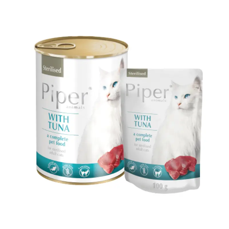 Η Piper Cat Wet Food Adult Sterilises with Tuna είναι μια πλήρης υγρή τροφή για ενήλικες στειρωμένες γάτες με υψηλής ποιότητας τόνο. Διαθέσιμη σε κονσέρβα και πρακτικά φακελάκια.