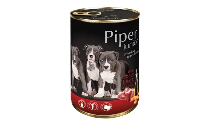Η υγρή τροφή για κουτάβια Piper – with Beef Hearts and Carrots περιέχει καρδιές βοδινού κρέατος οι οποίες είναι πηγή εύπεπτων και υψηλής ποιότητας πρωτεϊνών και λιπαρών οξέων. Το βοδινό κρέας και τα παράγωγά του είναι πηγή σεληνίου, σιδήρου και χαλκού – μέταλλα που παίζουν σημαντικό ρόλο στην τόνωση των αμυντικών μηχανισμών του νεαρού οργανισμού. Η προσθήκη καρότου βελτιώνει τη γεύση του φαγητού, ρυθμίζει τη λειτουργία του γαστρεντερικού σωλήνα και βελτιώνει την απορρόφηση των υπόλοιπων θρεπτικών συστατικών. Η πλούσια σε θρεπτικά συστατικά σύνθεση εξασφαλίζει την ισορροπημένη ανάπτυξη και την καλή αίσθηση του νεαρού σκύλου.