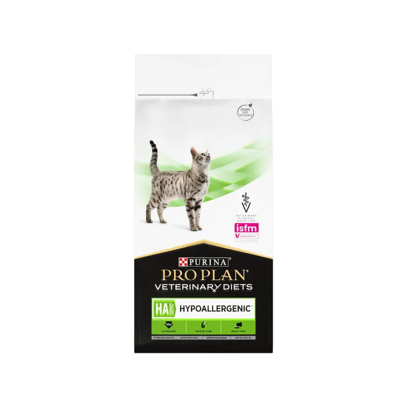 Η Pro Plan® Veterinary Diets Dry Cat Food HA Hypoallergenic είναι μια πλήρης ξηρή τροφή επιστημονικά σχεδιασμένη για να βοηθά στη διάγνωση και διαχείριση τροφικών αλλεργιών σε γάτες όλων των ηλικιών και στα γατάκια.