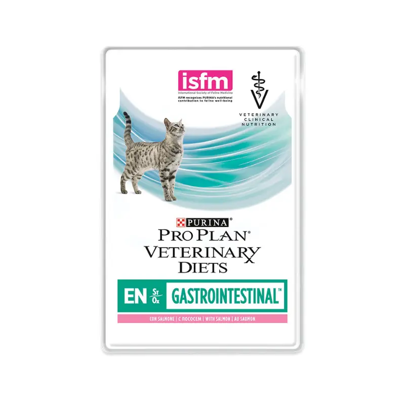 Τα φακελάκια της Pro Plan® Vet Diets – EN Gastrointestinal with Salmon είναι μία πλήρης υγρή τροφή με κομμάτια σολομού σε σάλτσα, επιστημονικά σχεδιασμένη για γάτες με γαστρεντερικές διαταραχές.