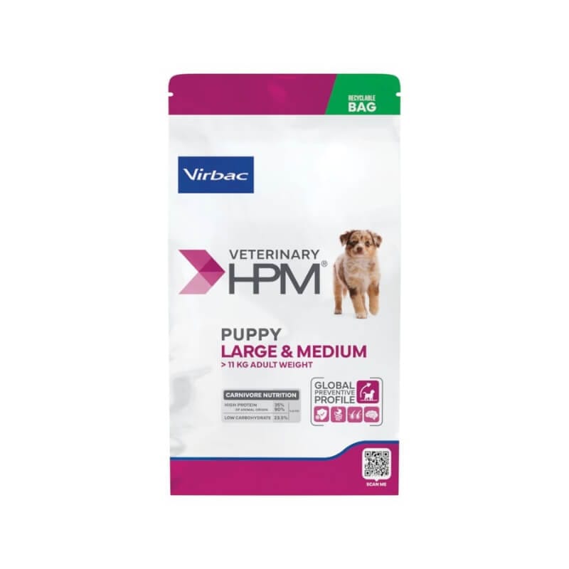 Η υψηλή περιεκτικότητα σε λιπαρά και πρωτεΐνες παρέχει στο σκύλο σας την ενέργεια που χρειάζεται σε αυτή τη φάση της ζωής του. Η τροφή για κουτάβια είναι απαλλαγμένη από γλουτένη και χαμηλή περιεκτικότητα σε αλλεργιογόνα, καθιστώντας την ιδιαίτερα εύπεπτη. ΗVirbac Veterinary HPM Baby Dog Large & Medium έχει ιδανική αναλογία ασβεστίου και φωσφόρου. Αυτά τα σημαντικά μέταλλα είναι απαραίτητα για τη διατήρηση φυσιολογικών οστών και δοντιών. Η ξηρά τροφή είναι καλά αποδεκτή χάρη στην καλή της γεύση.